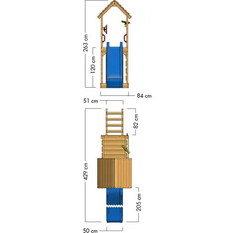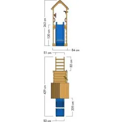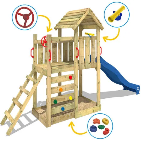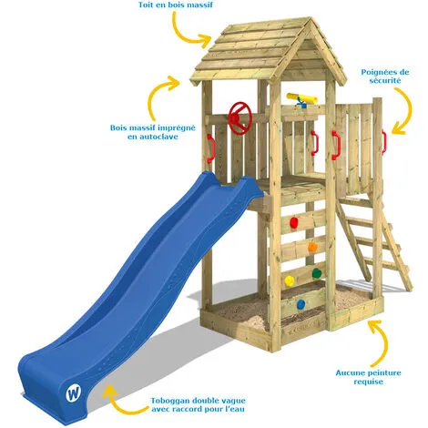 - CaractĂ©ristiques: Mur d’escalade, Toboggan, Bac Ă sable