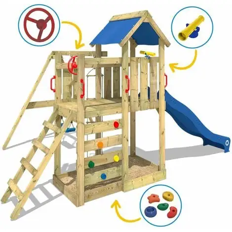 - CaractĂ©ristiques: Balançoire, Echelle, Maisonnette, Mur d’escalade, Toboggan, Bac Ă sable, Échelle de corde