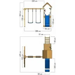 - CaractĂ©ristiques: Balançoire, Mur d’escalade, Toboggan, Bac Ă sable