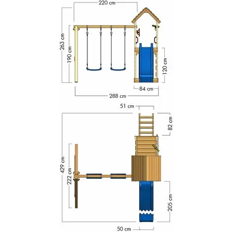 - CaractĂ©ristiques: Balançoire, Mur d’escalade, Toboggan, Bac Ă sable