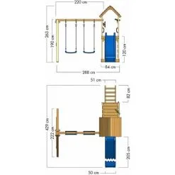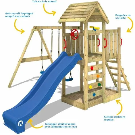 - CaractĂ©ristiques: Balançoire, Echelle, Mur d’escalade, Toboggan, Bac Ă sable, Tour