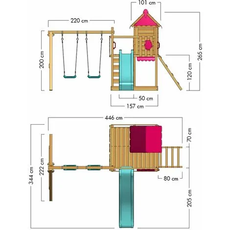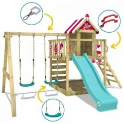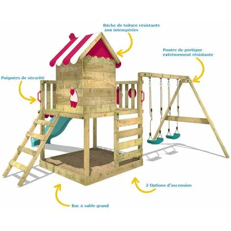 - CaractĂ©ristiques: Balançoire, Maisonnette, Mur d’escalade, Toboggan, Bac Ă sable