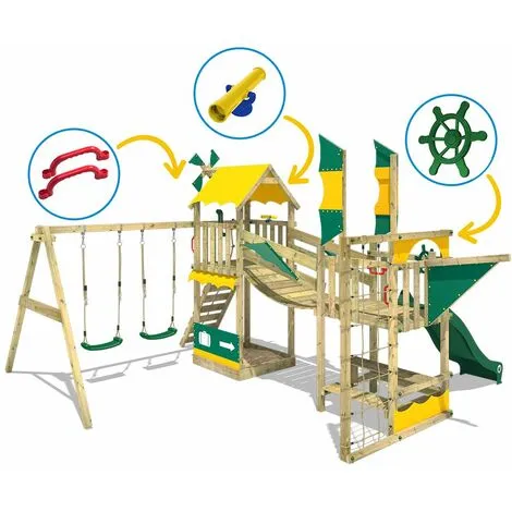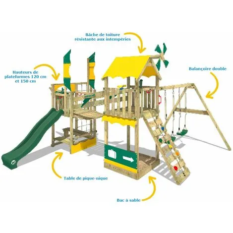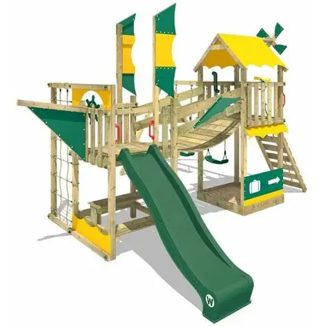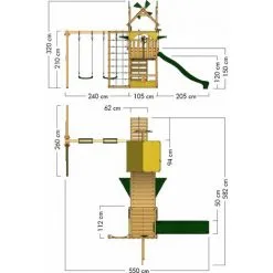 - Caractéristiques: Balançoire, Echelle, Maisonnette, Mur d’escalade, Pont suspendu, Toboggan, Filet à grimper, Bac à sable