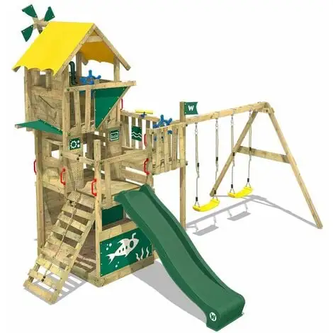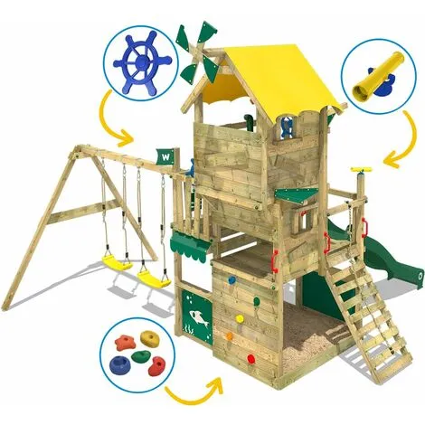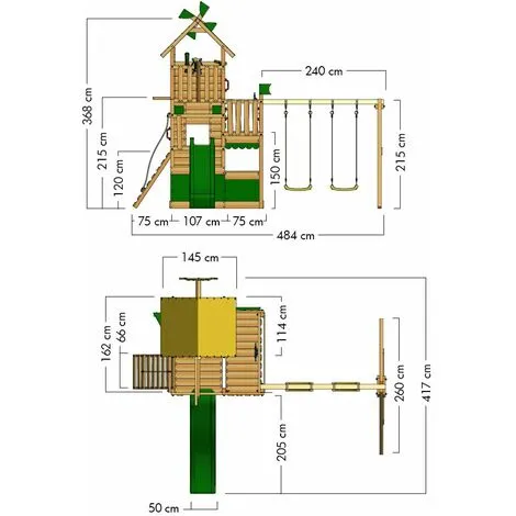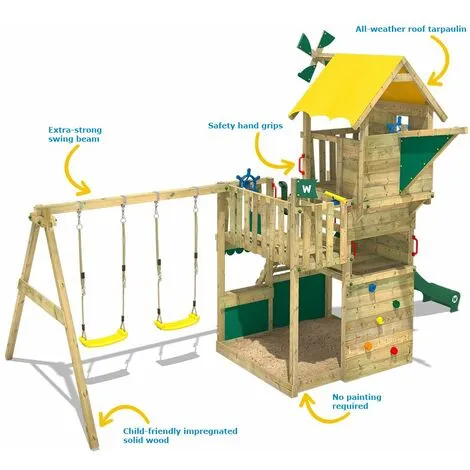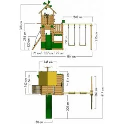 - CaractĂ©ristiques: Balançoire, Maisonnette, Mur d’escalade, Toboggan, Bac Ă sable