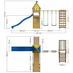 - CaractĂ©ristiques: Balançoire, Mur d’escalade, Pont suspendu, Toboggan, Bac Ă sable