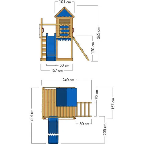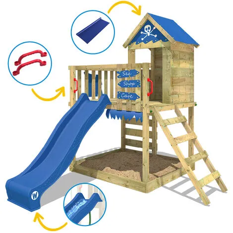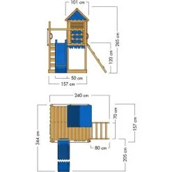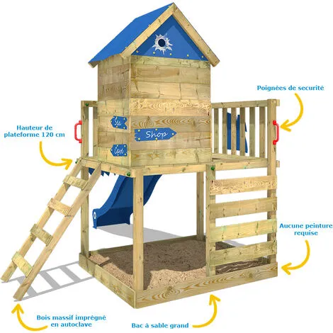 - CaractĂ©ristiques: Maisonnette, Mur d’escalade, Toboggan, Bac Ă sable