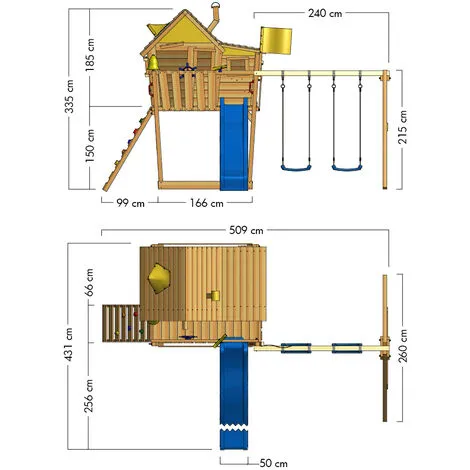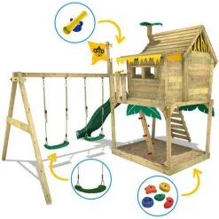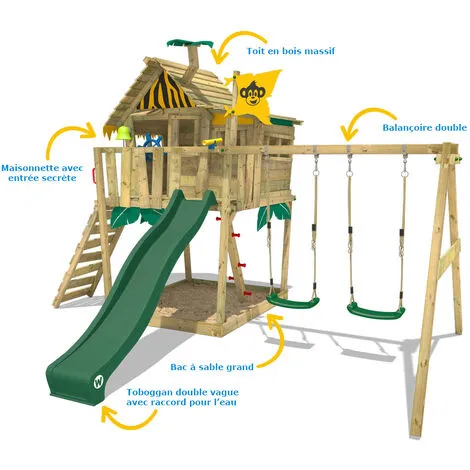 - Caractéristiques: Balançoire, Maisonnette, Toboggan, Bac à sable