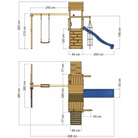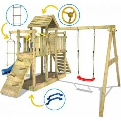 - CaractĂ©ristiques: Balançoire, Mur d’escalade, Toboggan, Bac Ă sable