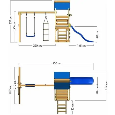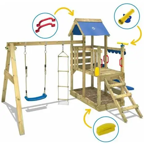 - CaractĂ©ristiques: Balançoire, Echelle, Maisonnette, Mur d’escalade, Bac Ă sable