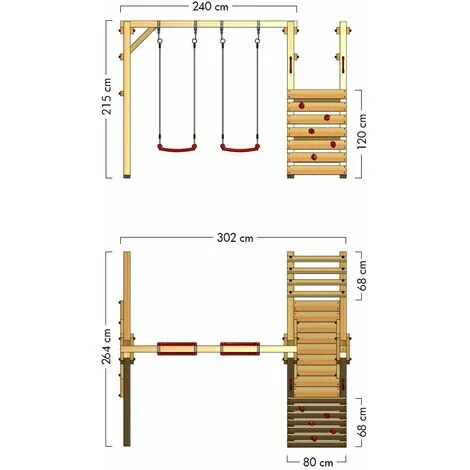 La combinaison d’une balançoire double classique et d’une extension d’escalade apporte du jeu et d’amusement dans tous les jardins ! Les poteaux robustes de 9×9 cm offrent une stabilitĂ© optimale, mĂŞme lors des aventures de balancement les plus extrĂŞmes. La plateforme d’une hauteur de 120 cm convient aussi bien aux grands qu’aux petits enfants et leur garantit un amusement maximal pendant de longues annĂ©es.