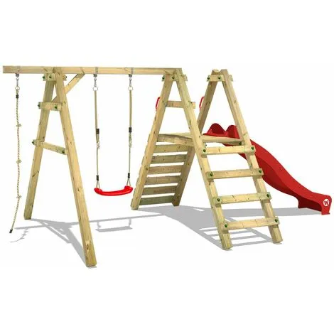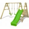 La balançoire pour enfants en bois carrĂ© rĂ©unit le plaisir du balancement et de glissade. Une particularitĂ© est la flexiblilitĂ© du raccord balançoire qui permet de dĂ©placer les poteaux de 9×9 cm d’Ă©paisseur. Transformez la balançoire double en une balançoire simple et fixez une corde Ă grimper ou une Ă©chelle de corde Ă la poutre saillante pour une variĂ©tĂ© de plaisir aux jeux !